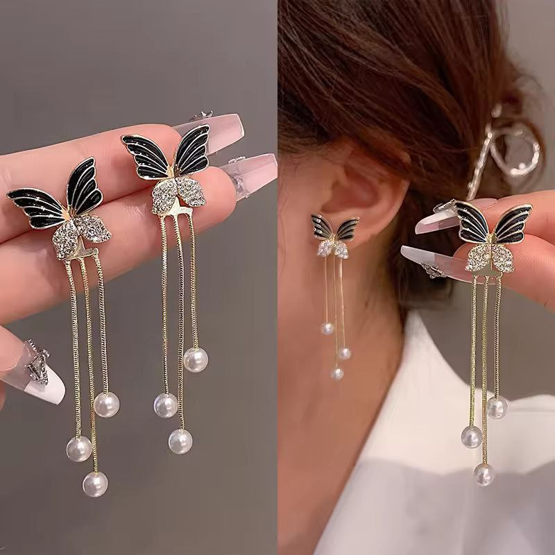 Korean Style Crystal Butterfly Drop Earring Long Tassel Rhinestone Dangle Earrings for Women Party Statement Earrings Jewelry