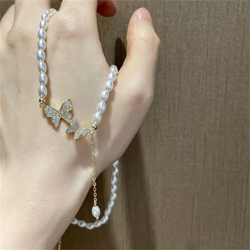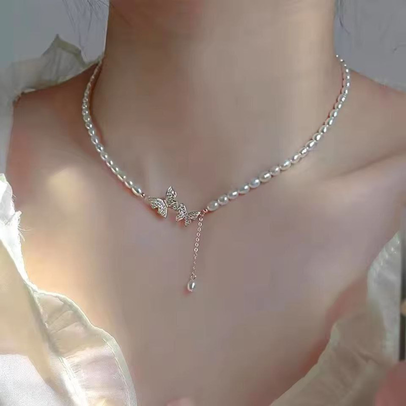 Pearl Choker Necklace For Women Girls Dainty Double Rhinestone Butterfly Necklace Wedding Party Jewelry