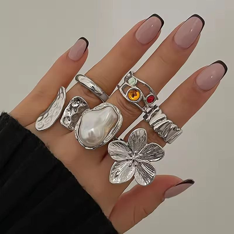 SW830925Adjustable Punk Exaggerated Metal Rings Set for Women Men Vintage Flower Pearl Crystal Europe America Open Luxury Jewelry