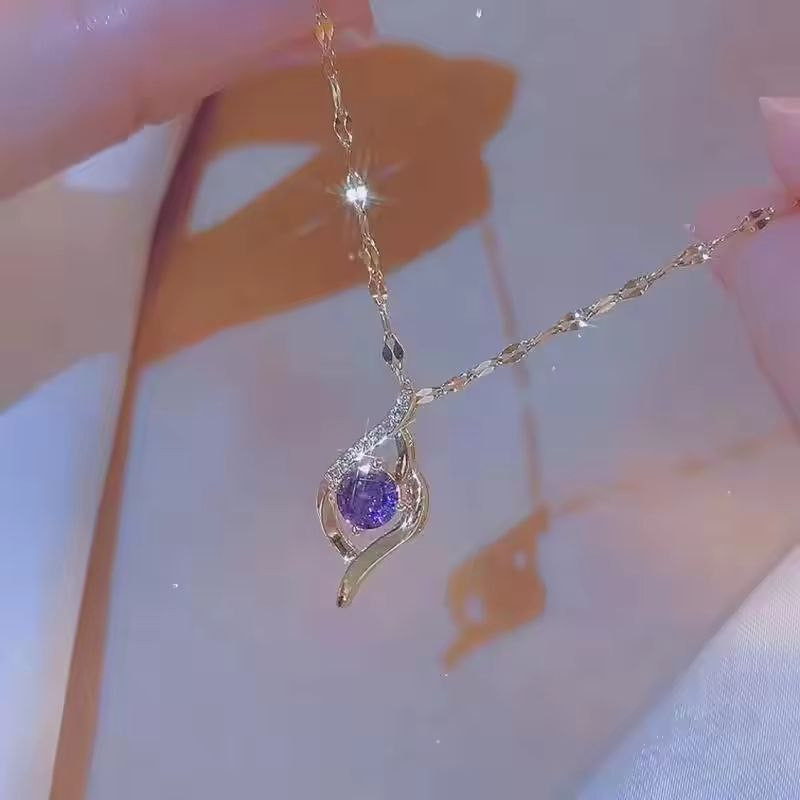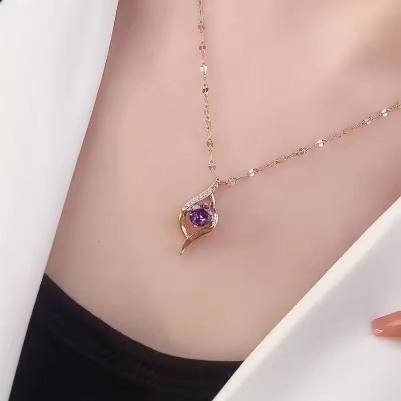 SW800925Fashionable Titanium Steel Collarbone Chain, Elegant Purple Zircon Inlay Heart-shaped Pendant, Simple Necklace for Women